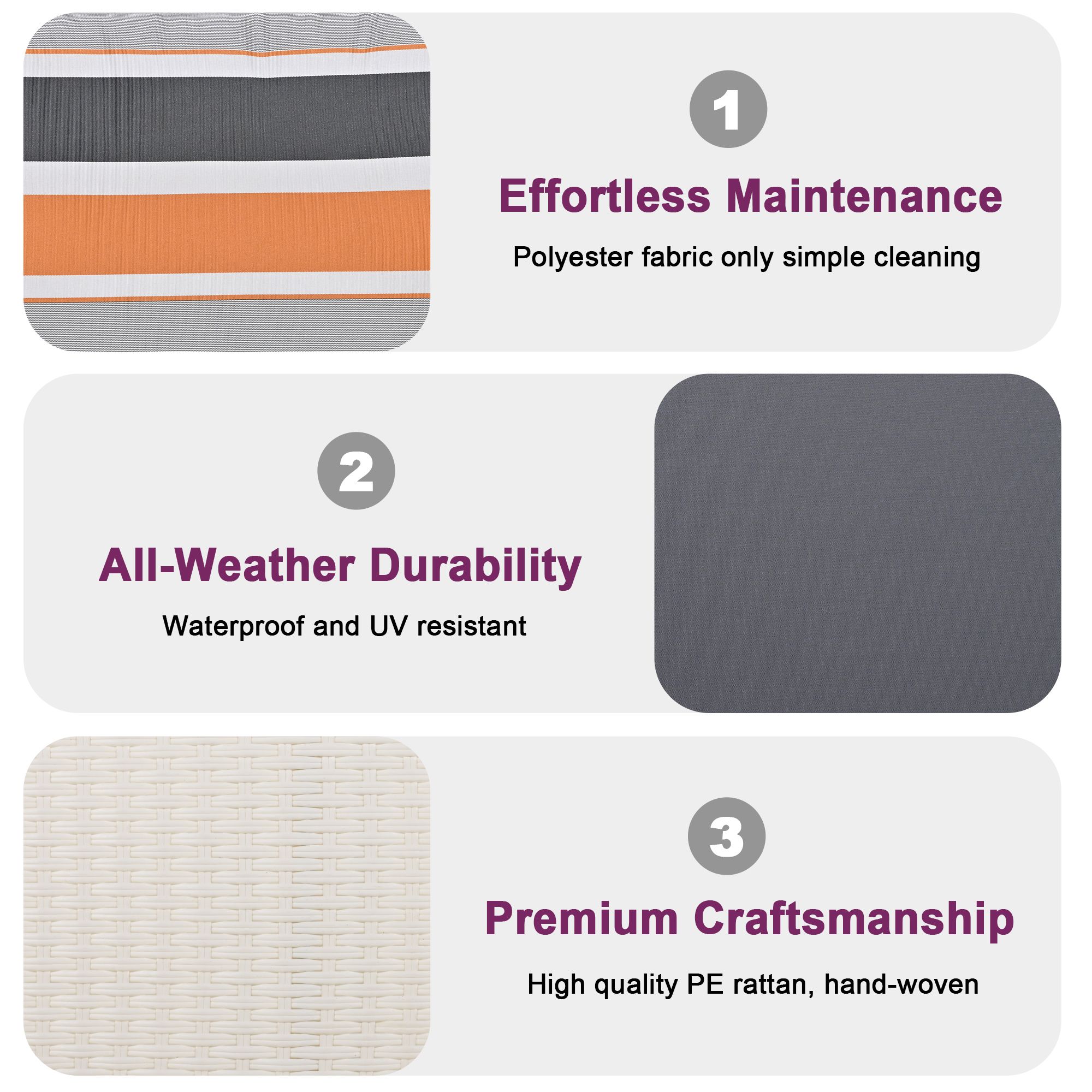 4.Vibrant Pillows: Accompanied by a generously sized seat cushion and back cushion, this ensemble is further enhanced by the addition of two vibrant pillows. These colorful accents not only offer an extra layer of comfort but also allow for personalized placement – whether nestled at your side or gently propped behind – ensuring a truly indulgent relaxation experience.