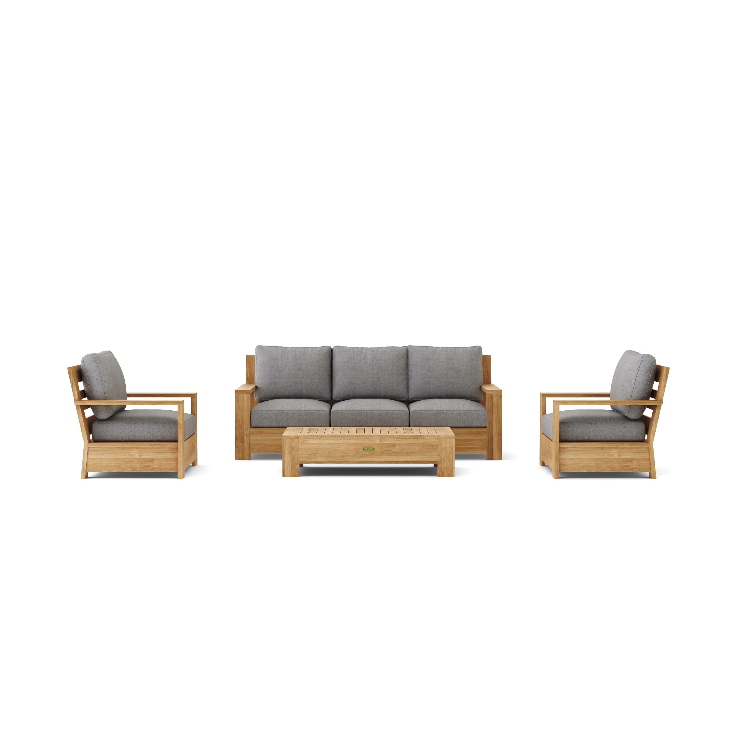 A mix of modern and classical design, this Madera Deep Seating Set is sure to amaze with its straight solid arm design contrasting the arched curvature of its legs and back. A platform deep seater that’s sturdy, solid all around, and manufactured from premium grade solid teak wood, it’s treated unfinished and sanded smooth for a natural finish. Ergonomically comfortable and aesthetically pleasing, careful attention was placed on the design of the seats back for optimal lumbar comfort and back support while maintaining artistic quality with its unique slats pattern design. Includes 6”cushions from All-Weather Sunbrella Fabrics with color and pattern options.