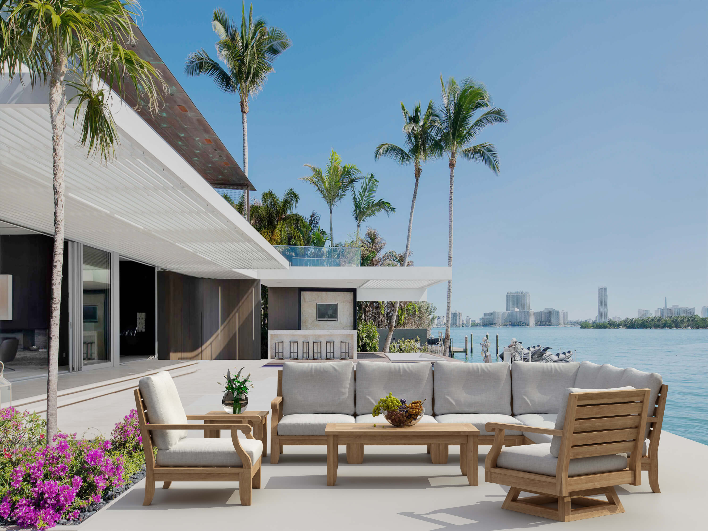 A premium deep seating set that sits up to seven, the Riviera Modular Deep Seating is a luxuriously-comfortable set that indulges whoever sits in its presence. Perfect for the home or yard, its considerable size and quality built frame blends seamlessly with its artistic curve design and armchair circular whorl. Made of premium grade unfinished teak, the set arrives with the Riviera Right, Left, Corner, and three Center modulars for a combined “L” shaped sectional couch that sits up to five. Also included is the Riviera Armchair, the Riviera Rectangular Coffee and Square table, and the Riviera Swivel Armchair; with a swivel mechanic that smoothly rotates up to 360 degrees of motion holding firmly in place at any degree. Includes 6” thick cushions from All-Weather Sunbrella Fabrics with choice of color and pattern option.