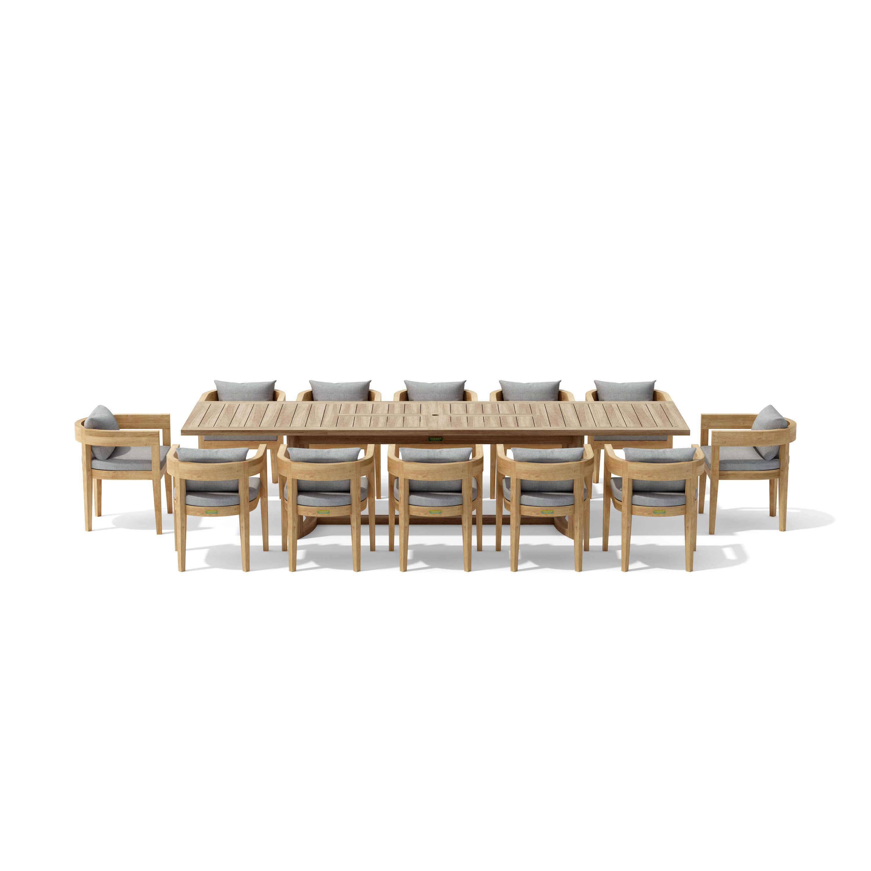 Host unforgettable outdoor gatherings with the Coronado Extension Dining Table Set. This spacious 13-piece set, crafted from premium teak, accommodates up to 12 people. The Coronado Extension Dining Table is a sturdy and well built solid teak outdoor dining table measuring 88″ in length (closed) or 136″ in length (fully extended) perfect for the home or yard. Simply slide open one or both extension leaf’s on either end to reveal two extra leaf’s in the middle for extra table space when needed, with umbrella hole in the middle and wooden plug when not in use. The extendable dining table offers flexibility for various occasions, while the comfortable Sunbrella cushions with your color option, ensure a relaxing dining experience.