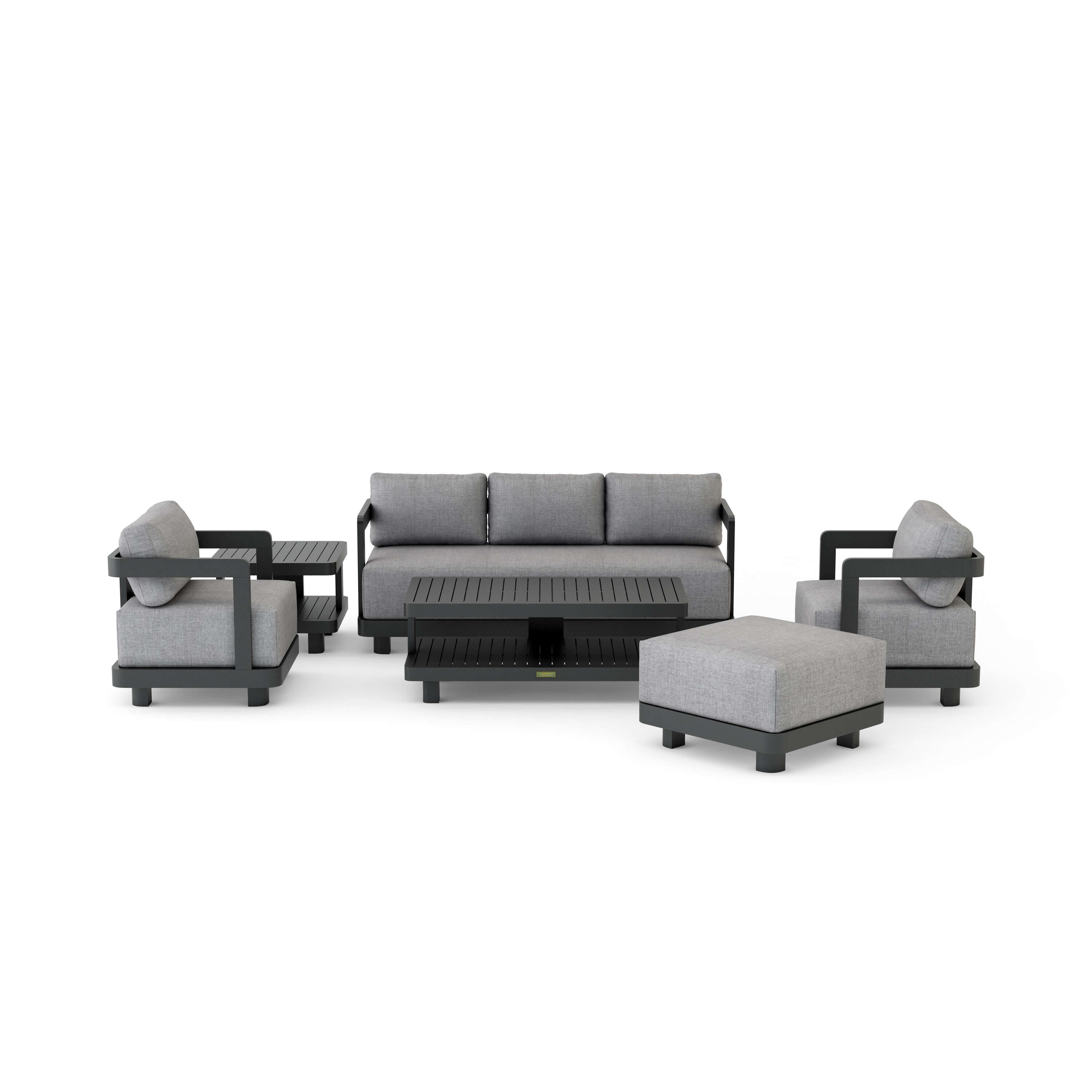 The perfect lounge set for family and friends enjoy a pleasant gathering with a drink and a chat with the 6-pc Granada Deep Seating Aluminum Set. Comfortable and stylish, this collection features two Granada Deep Seating Aluminum Armchairs with spacious seating space and large cushions 10½” thick measuring 26” wide by 26½” in length. Set also includes the extravagant Granada Deep Seating Aluminum Sofa, one Granada Ottoman, the Granada Rectangular Coffee Table and the Granada Side Table. Machine crafted from an aluminum frame and powder coated in a dark grey finish, it’s the perfect material for outdoor weathered use.